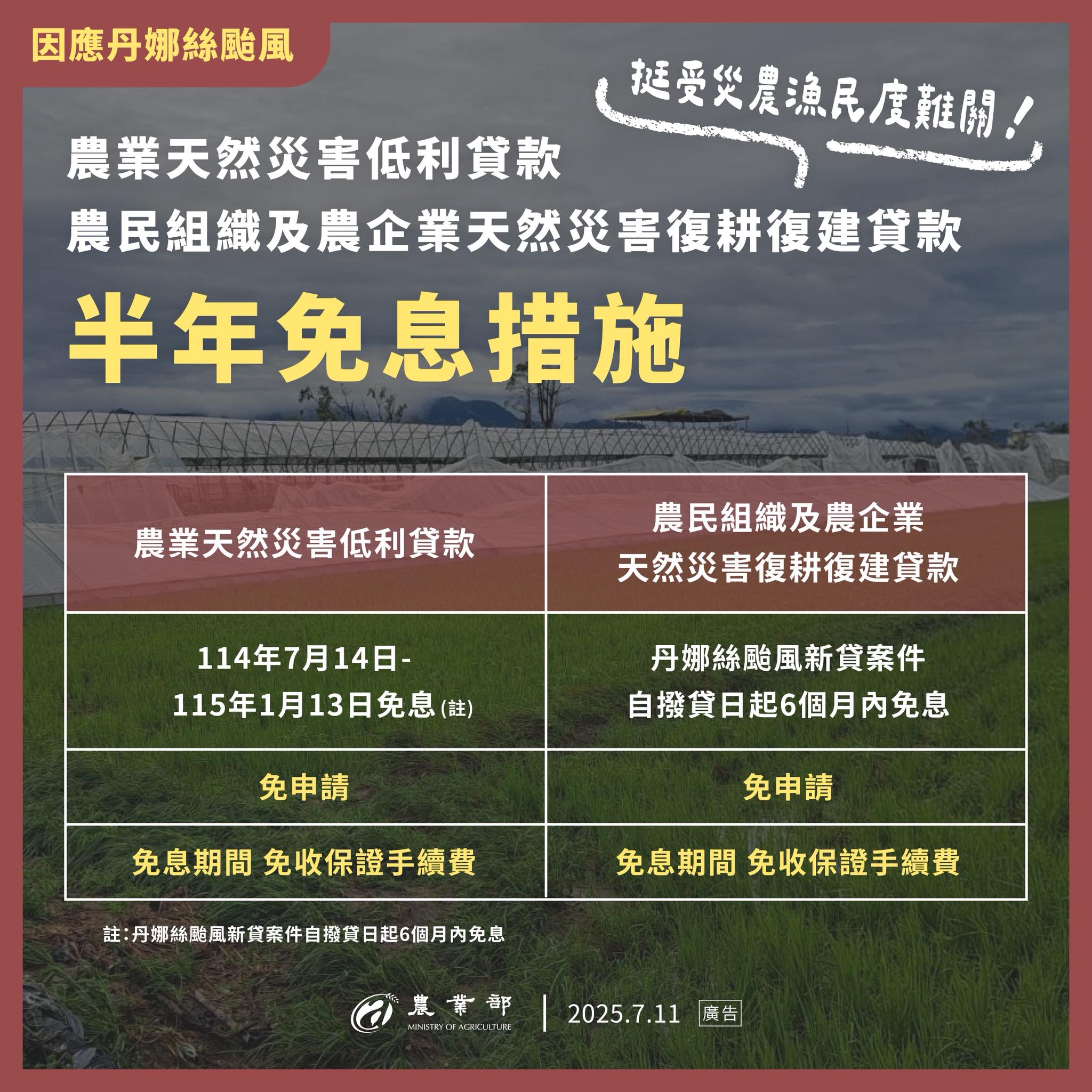 【農漁民災貸】 新、舊貸皆適用半年免息 免申請、免保證手續費 【農企業/農民組織災貸】 新貸案享半年免息 同樣免申請、免保證手續費 貸款諮詢與申辦請洽 旗山區農會:(07)6615491轉信用部